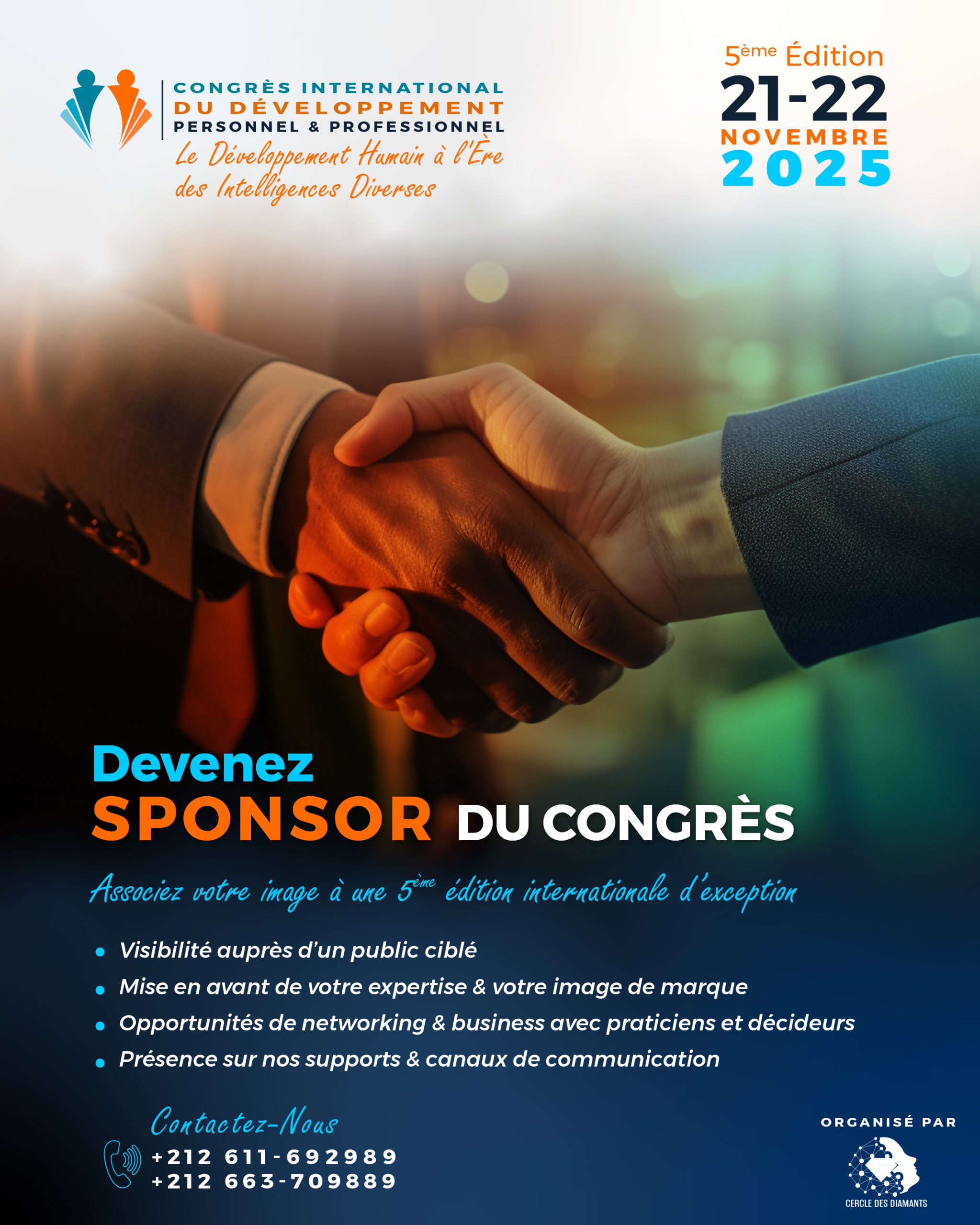 En devenant sponsor officiel du Congrès International du Développement Personnel et Professionnel, vous associez votre marque à un évènement d’envergure, réunissant des experts, des décideurs et des passionnés venus du Maroc et de l’étranger.